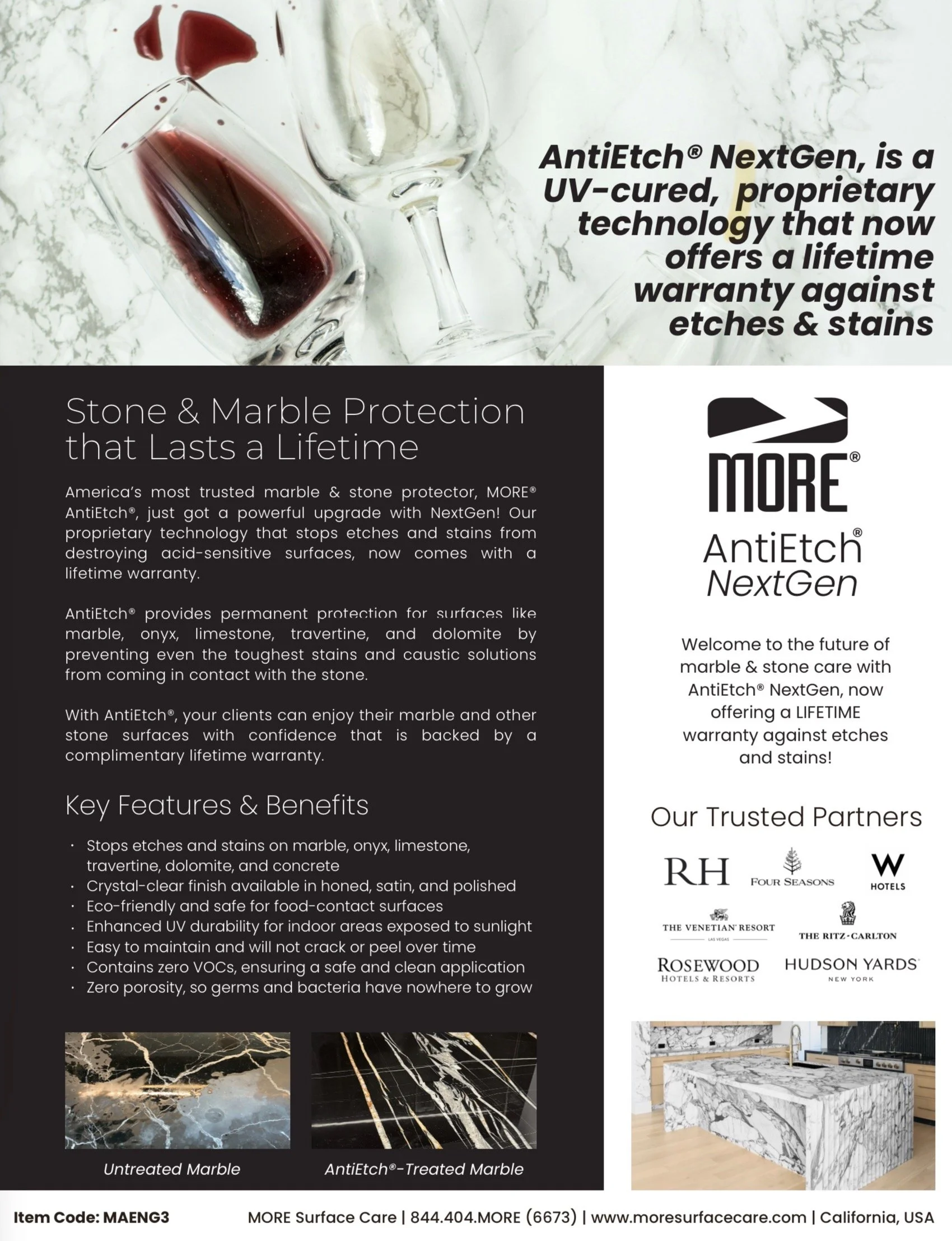 MORE® AntiEtch® ('Product") must be installed by a MORE® AntiEtch® Certified Applicator ('Certified Applicator') in accordance with application instructions provided by MORE® Surface Care, LLC (MORE®). The Product's warranty must be registered at roxsurfacesolutions.com.